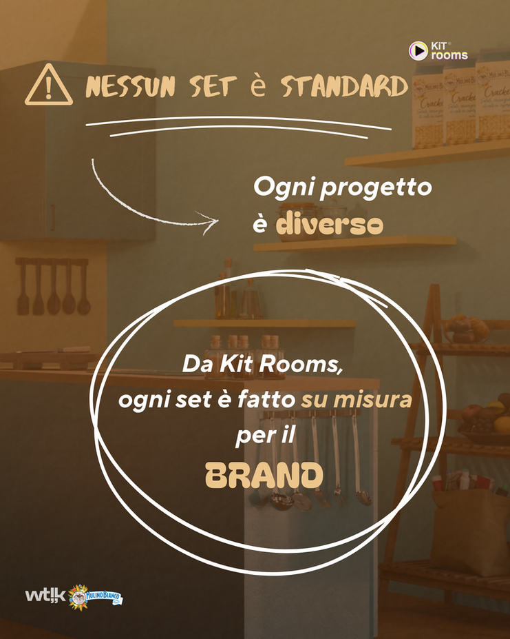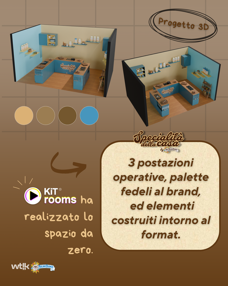 Per Specialità della Casa, il nuovo cooking show di Wtlk e Mulino Bianco, abbiamo trasformato un set vuoto in una cucina scenografica e funzionale. Un set vivo, pensato per accogliere 12 concorrenti divisi in 4 squadre, giudici sempre diversi e una conduttrice d’eccezione. Ogni dettaglio è stato progettato per unire racconto e competizione, identità e sapori. Un ambiente dove non si cucina soltanto, ma ci si racconta.